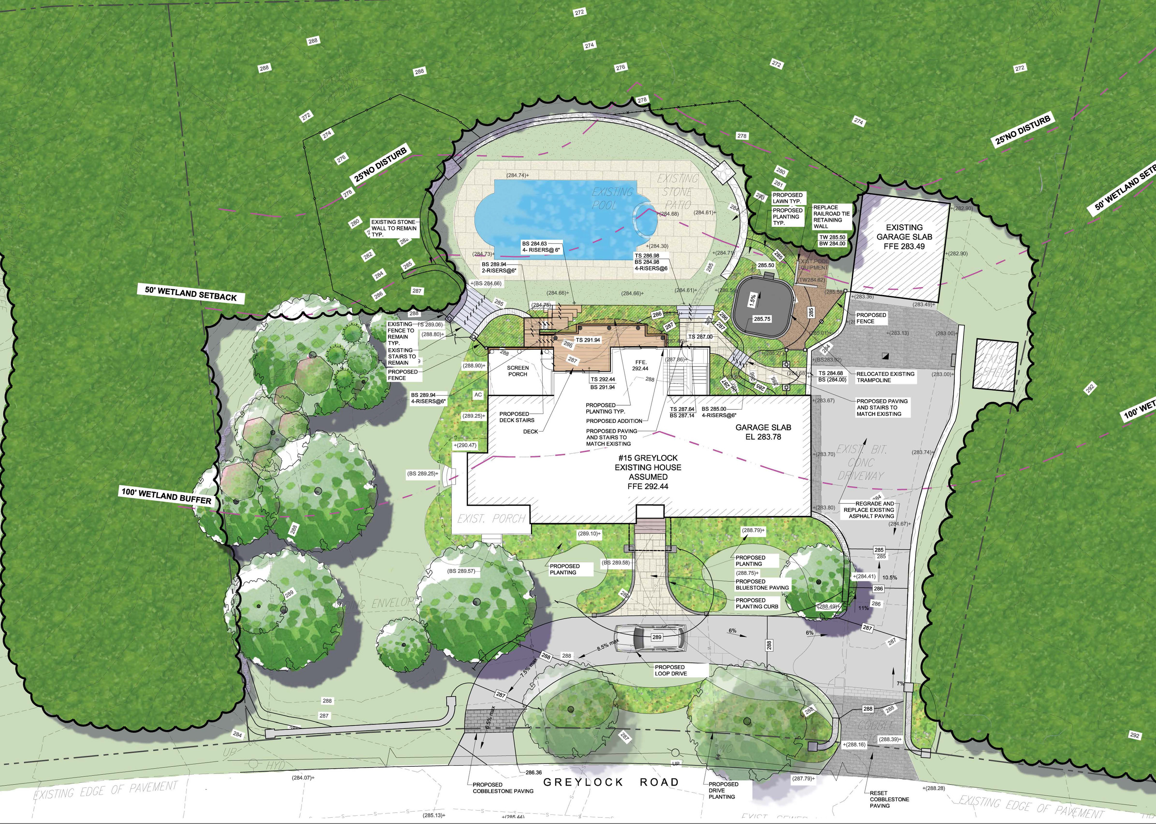 The project in Wellesley required landscape restoration after a new addition at the rear of the home and a new drive turn around at the front entrance. This is one of multiple iterations of proposed layouts.